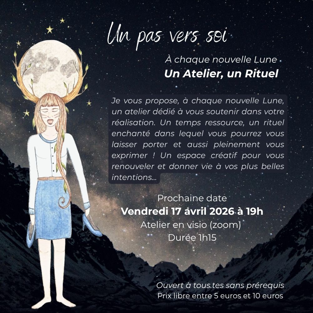 Je vous propose, à chaque nouvelle Lune, un atelier dédié à vous soutenir dans votre réalisation. Un temps ressource, un rituel enchanté dans lequel vous pourrez vous laisser porter et aussi pleinement vous exprimer ! Un espace créatif pour vous renouveler et donner vie à vos plus belles intentions…