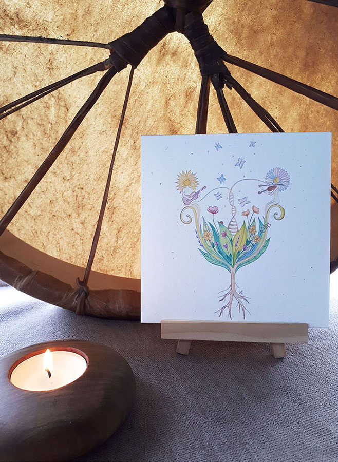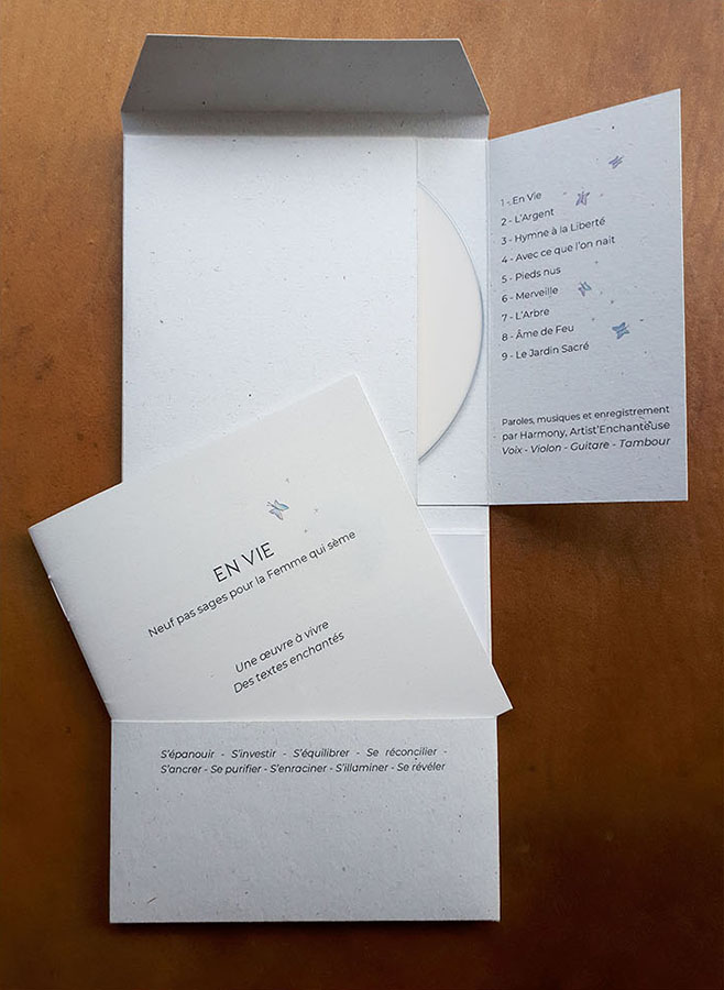Plus qu’un album, « EN VIE » est un coffret dans lequel 9 chants et 9 illustrations soutiennent et vibrent les intentions suivantes : S’épanouir – S’investir – S’équilibrer – Se réconcilier – S’ancrer – Se purifier – S’enraciner – S’illuminer – Se révéler.